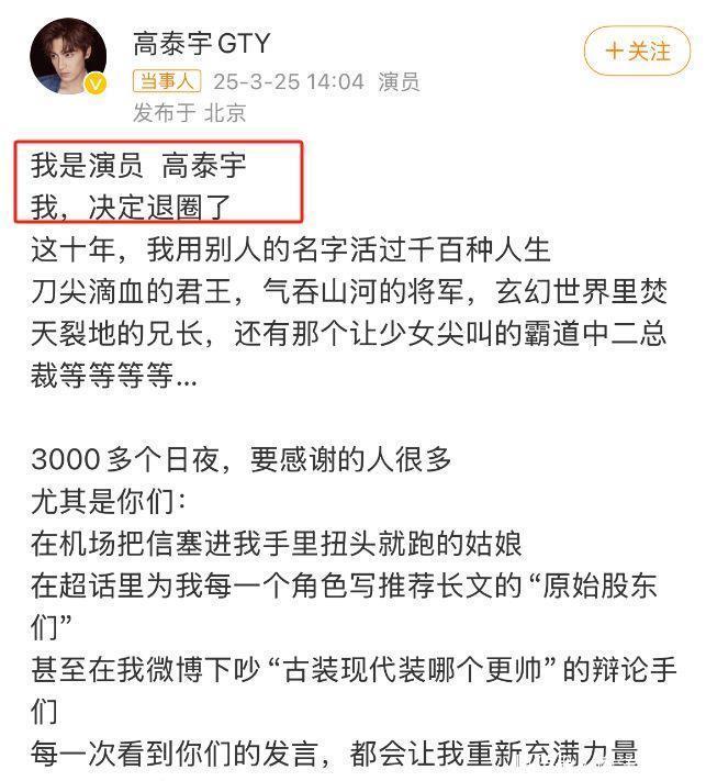 3月25日,高泰宇突然发文宣布退圈。
